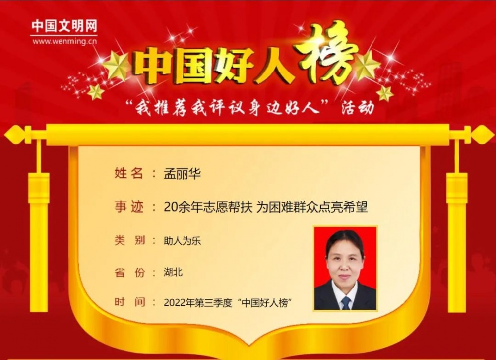 孟麗華,女,漢族,1970年生,中共黨員,荊門市公共交通集團(tuán)有限公司點(diǎn)鈔中心副主任、荊門市圓夢(mèng)愛(ài)心幫扶會(huì)會(huì)長(zhǎng)。二十多年來(lái),孟麗華通過(guò)捐資助學(xué)、扶老助殘、幫扶貧困,將幾十多萬(wàn)元工資獎(jiǎng)金和全部工余時(shí)間都用來(lái)做志愿服務(wù),把助人當(dāng)做自己的快樂(lè)和幸福,向社會(huì)傳遞著溫暖和關(guān)愛(ài)。先后獲得全國(guó)三八紅旗手、全國(guó)孝親敬老之星、湖北省五一勞動(dòng)獎(jiǎng)?wù)隆⑶G楚楷模、湖北省十大愛(ài)心助殘人士、崗位學(xué)雷鋒標(biāo)兵等榮譽(yù)稱號(hào)。