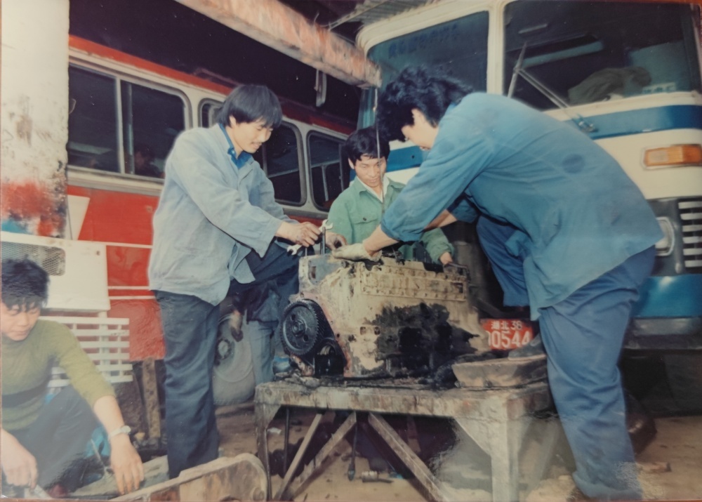 ▲80年代,車間修理工檢修模樣。3個機(jī)修工一同修理著車輛發(fā)動機(jī),臉上沒有吃力感,更像是帶著興趣在專研。