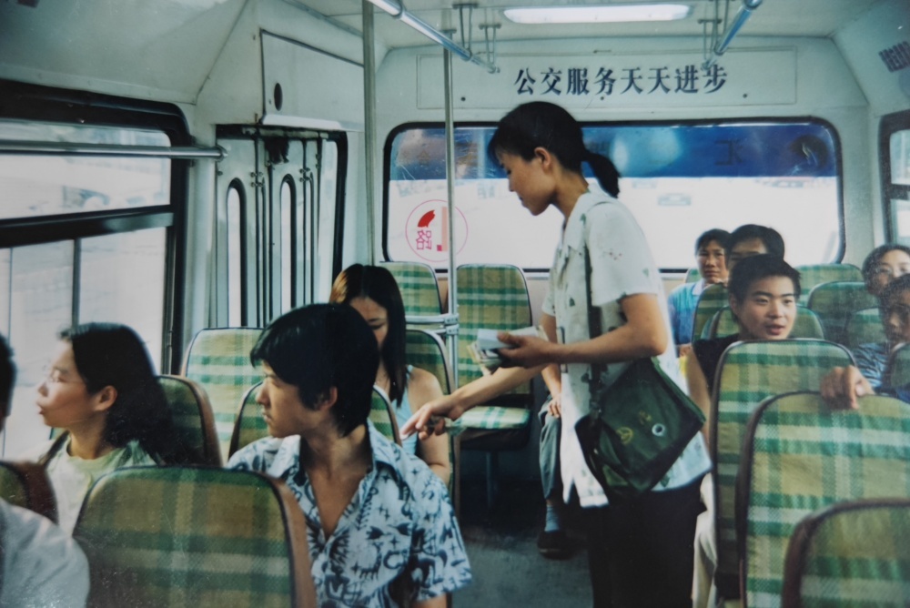 ▲90年代,公交售票員工作模樣??嬷卑种心弥沐X和車票,收錢、找錢、給票、查票行云流水。高峰期數(shù)十人上下車,想要收好票款,無疑是一種考驗,而她們久經(jīng)考驗。