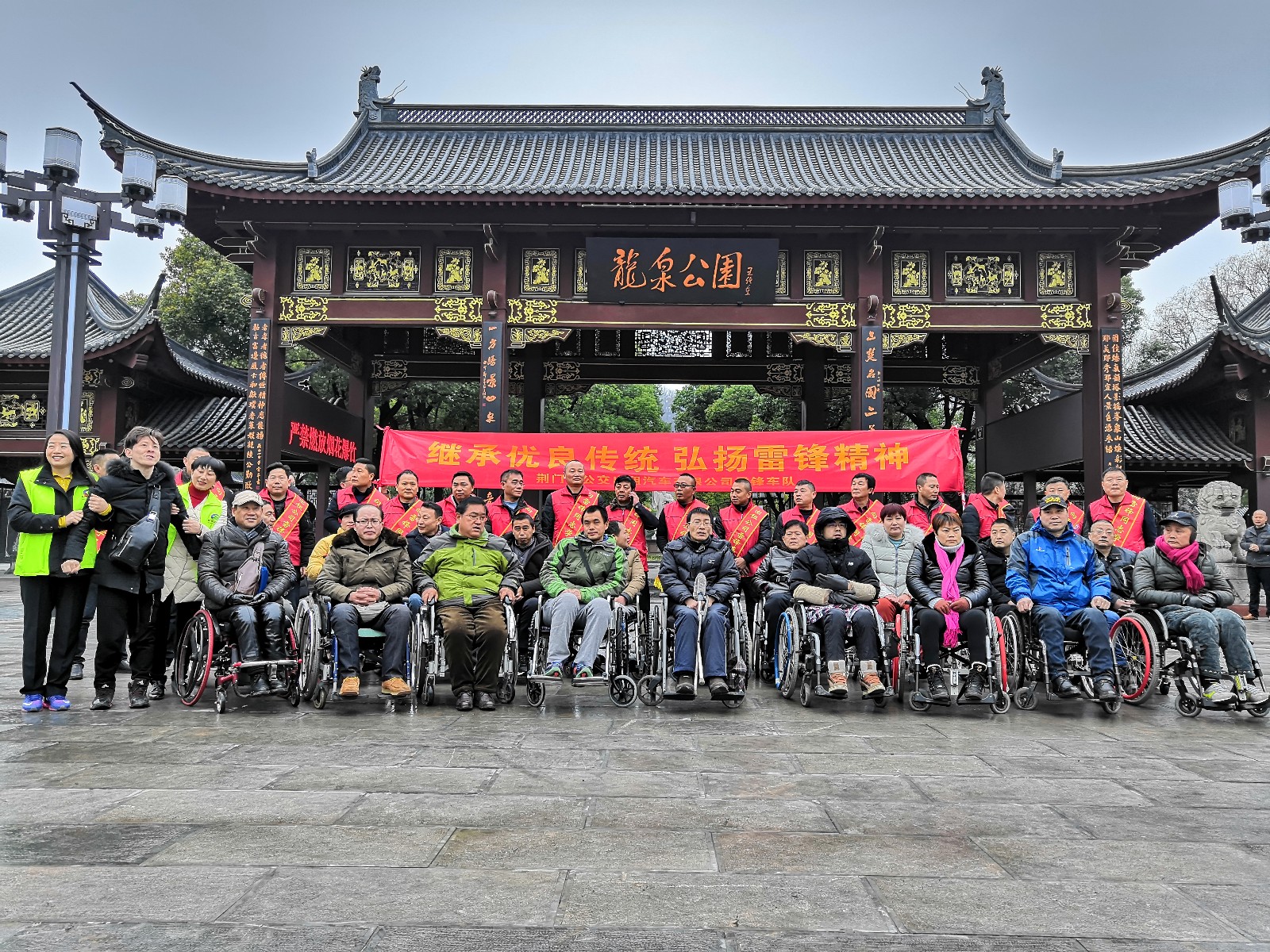 10時,車隊到達龍泉公園,在新修建的公園門口殘疾朋友集中合影留念,在公交黨支部的帶領下共同宣讀入黨誓詞,唱雷鋒歌。在融洽歡樂的氛圍下開始了游園之行。