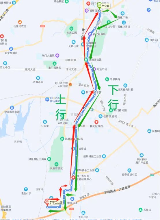 上行線路走向為:福力徳-鳳凰五路-創(chuàng)業(yè)四路-科技園路-創(chuàng)業(yè)二路-興隆大道-虎牙關大道-白云大道-文化宮。