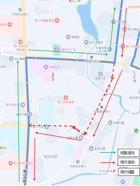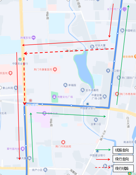 調(diào)整后新增停靠站點(diǎn):瀏河橋(西側(cè))、金寧小區(qū)(西側(cè))、荊門(mén)電視臺(tái)(西側(cè))、鳳臺(tái)社區(qū)(北側(cè))、海慧中學(xué)(北側(cè))。